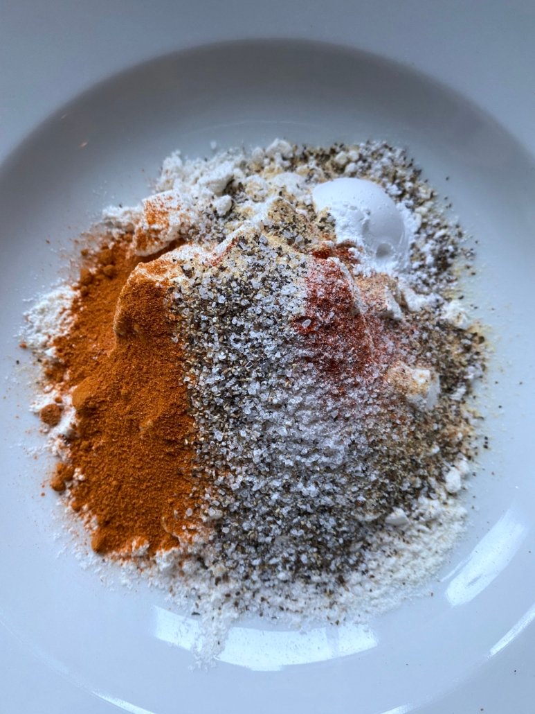 Put the flour, salt, pepper garlic pepper, paprika, cayenne and baking powder in a dish.