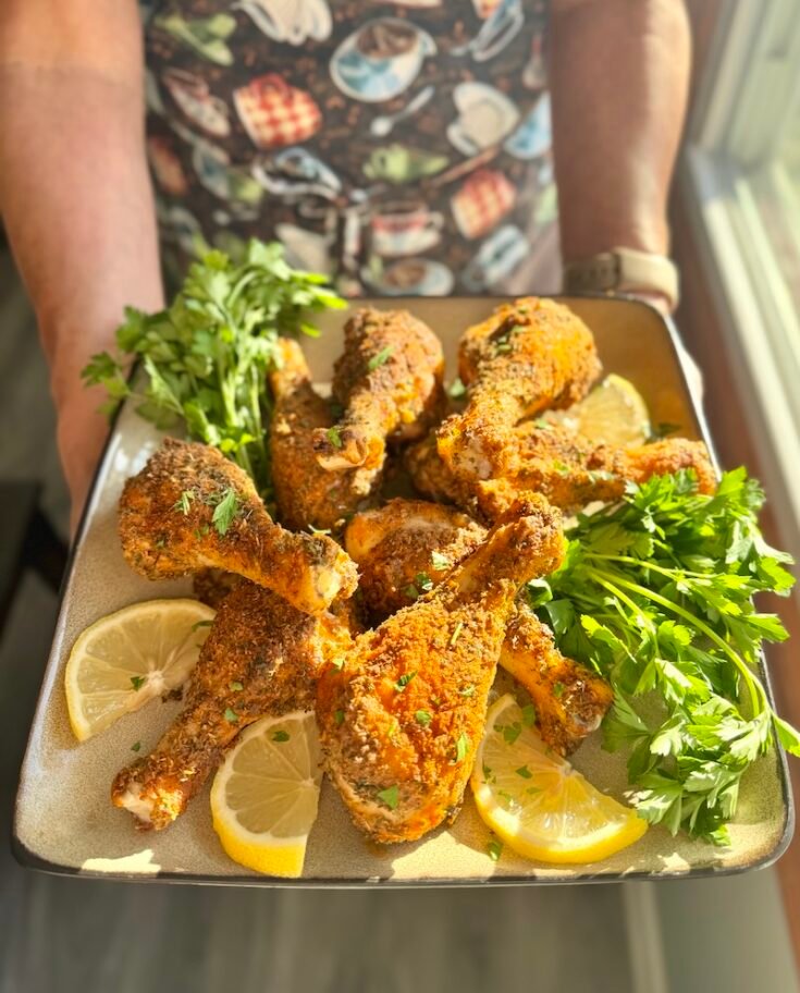 Place the coated drumsticks on the baking rack. Once all pieces are coated, generously spray the chicken on all sides with avocado oil spray.